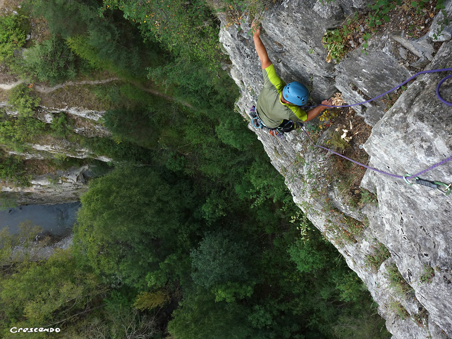 Des voies de faible hauteur (100 à 120m), à l’ombre, raides, dans un cadre superbe. Nous avons parcouru la Voie à Bada, la plus facile avec Gorges profondes parcourue cette année (à préférer dans ce niveau) puis Coule à Pic, légèrement plus soutenue avec un très beau final.
