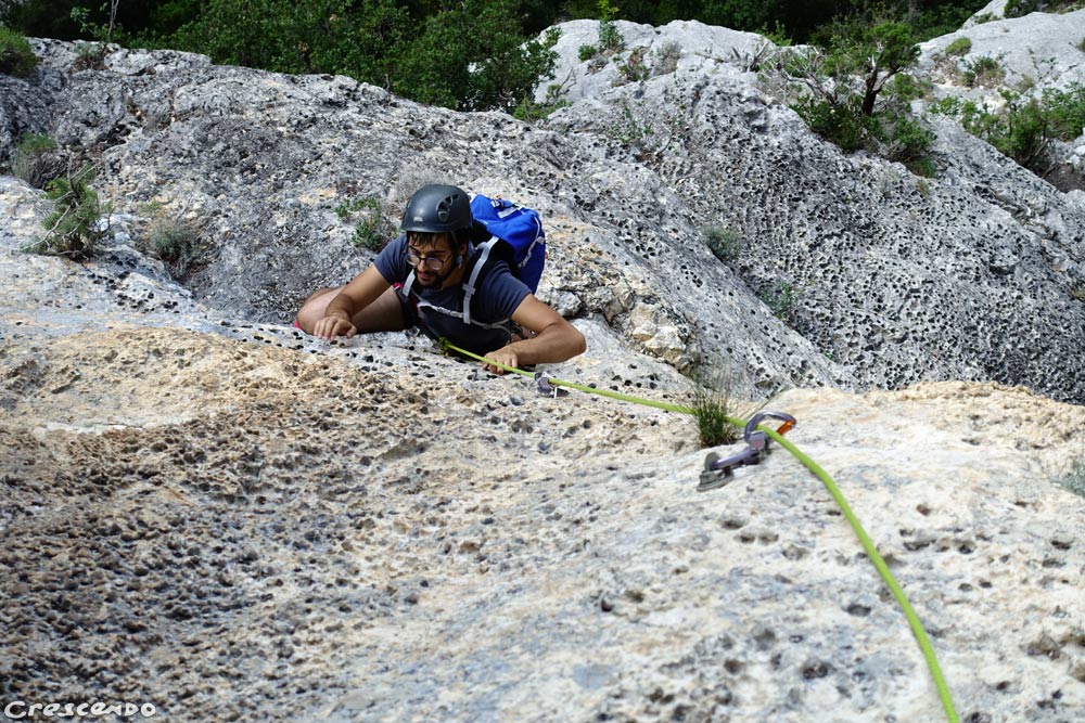 Une longueur dans le 6a, dans un dièdre, c’est l’ambiance des premières, ardue pour le grimpeur sportif d’aujourd’hui. Mais l’équipement est au top, alors on peut s’y frotter sans crainte. Le reste est plus classique, prises franches, beaux murs gris et majesté du lieu. Si on se sent, franchement la variante par le Rasoir est exceptionnelle! N’ayons pas peur des mots, le plus beau 5c+ des Gorges.