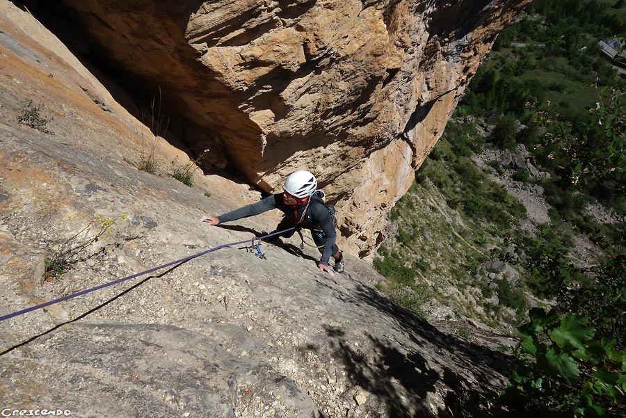 On frôle les 200m quand même… et on parcourt de bien belles longueurs. Le manque d’ampleur du aux vires entre les beaux bastions pourra décevoir certains, mais le panorama et les très beaux moments de grimpe raviront les autres!