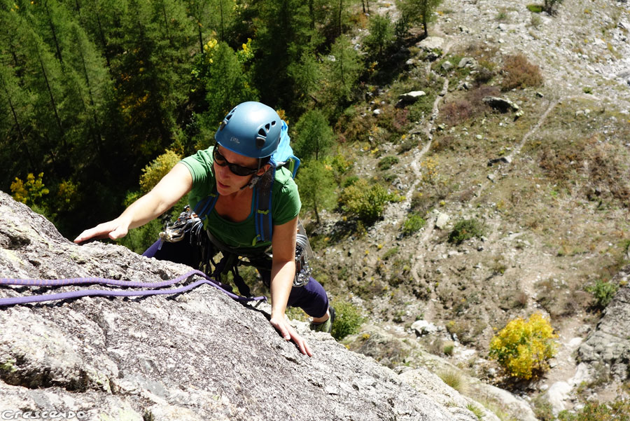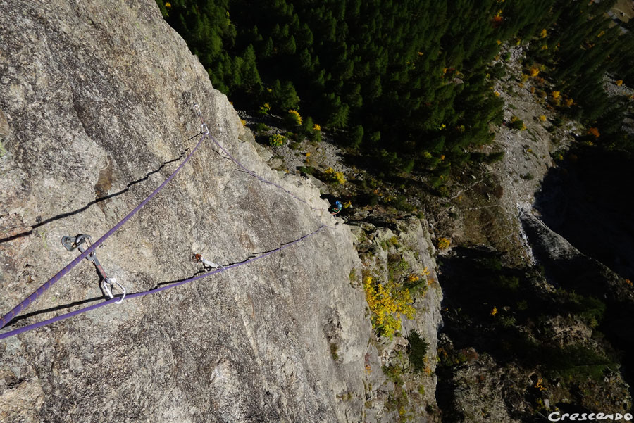 Une voie aux difficultés bien souvent homogènes, on grimpe longtemps dans les longueurs, loin des successions de pas entrecoupés de marche que pourrait laisser suggérer l’observation désabusée du pied de la falaise.