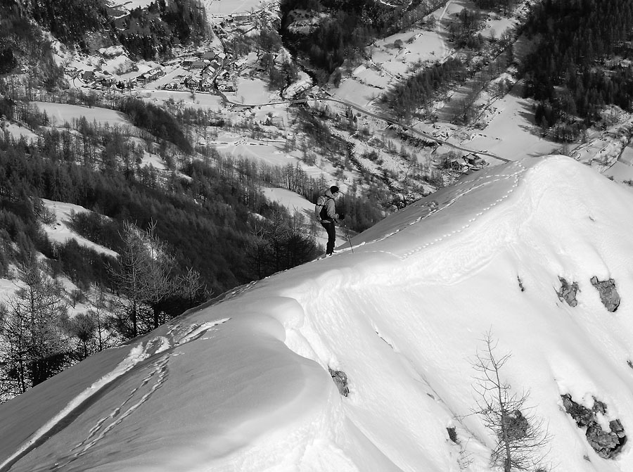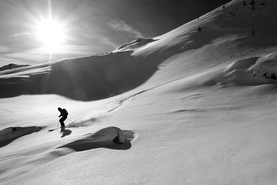 L’itinéraire suivi est classique (topo C2C) : col de la Fourche (2303m) par la Gardette puis très bonne descente sur la cabane des Rougnous, remontée sur la crête pour rejoindre la côte 2226m, un premier essai dans un couloir (conditions difficile – pente forte, neige dure, aucune visibilité sur la sortie) et nous remontons pour longer plus au Nord avant de finalement plonger dans une très belle combe est. Une neige très légère qui coule beaucoup mais en surface, il doit falloir éviter les grosses accumulations ici!