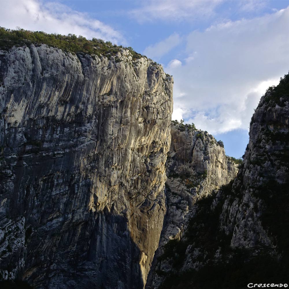 Ici nous nous trouvons comme à l’Offre dans une zone étroite des gorges. Les perspectives sur le pont du Galetas, le lac et les pédalos en contre bas donne une toute autre impression. Loin de l’ambiance austère sombre et écrasante du couloir Samson, le regard est submergé de couleurs et de lumières.