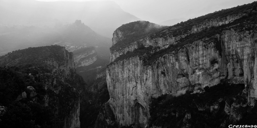 Temps toujours incertain le deuxième jour : les orages sont annoncés pour la fin de journée, la brume se lève doucement, les murs de l’Imbut sont mouillés, reste un créneau suffisant pour s’engager à l’Escalès. « Forts » de notre faible pratique du rocher verdonesque ces derniers temps (hormis les fissures), nous optons pour la partie haute de Via Mathis, le niveau semble soutenu mais l’équipement permettra de ne pas trop souffrir et l’itinéraire nous offrira une belle ambiance!